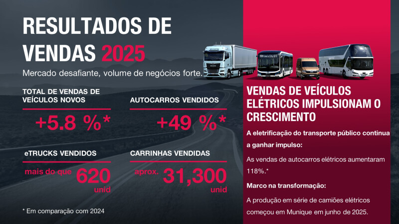 O segmento de camiões manteve-se praticamente estável num contexto de mercado exigente. Com cerca de 63.300 unidades vendidas, as vendas ficaram apenas ligeiramente abaixo do valor do ano anterior, com uma redução de 0,6%. O eTruck, cuja produção em série teve início apenas em 2025, registou uma procura elevada. Em 2025 foram vendidas mais de 620 unidades e a carteira de encomendas dos eTrucks já se encontra bem preenchida para 2026. O início previsto da produção em série do novo MAN eTGL de 12 toneladas, no final de 2026, irá completar o portefólio elétrico no segmento de camiões e representa mais um passo importante da MAN rumo à descarbonização da sua gama de veículos.