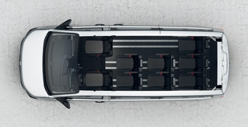 Assente exclusivamente na Caravelle de distância entre eixos longa, o Shuttle Flex introduz um piso modular em alumínio com sistema de calhas integradas que permite configurar cinco ou sete bancos individuais de forma rápida e intuitiva. Esta arquitetura transforma o habitáculo num espaço adaptável à missão: equipas desportivas, operadores turísticos ou empresas técnicas encontram aqui uma solução moldável às suas necessidades específicas. O sistema SecurePlus de reconhecimento de ocupação e os pontos ISOFIX com top tether reforçam a componente tecnológica e a segurança passiva, numa abordagem que alia funcionalidade a rigor construtivo.
