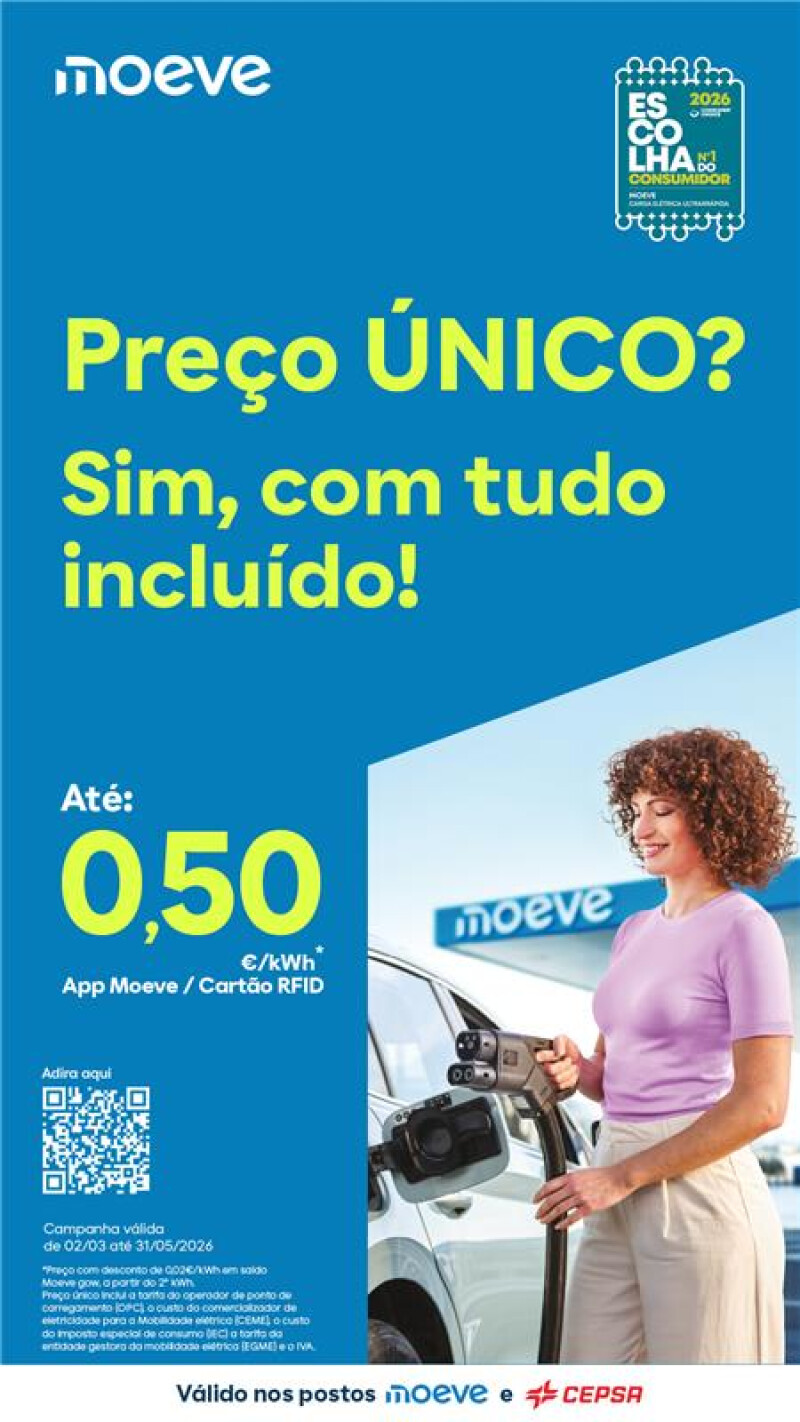 A Moeve anuncia o lançamento do preço único por kWh, com tudo incluído, em todos os seus pontos de carregamento elétrico ultrarrápido em Portugal. A partir de hoje, os utilizadores de veículos elétricos passam a poder carregar nos postos da marca por um preço fixo de 0,50€/kWh, um preço totalmente transparente que já inclui todas as taxas e impostos aplicáveis, eliminando surpresas na faturação e tornando o custo do carregamento simples, claro e previsível.