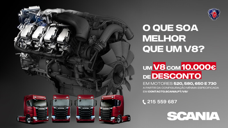 Para poder aceder a este desconto, só tem de adquirir o veículo antes de 31 de março, ou estar entre os 125 primeiros novos tractores ou rígidos de longa distância com motor Scania de 16 litros V8, adquiridos a partir da especificação mínima, detalhada na página web da Scania: https://contacto.scania.pt/v8/